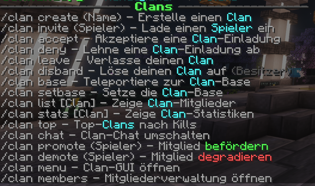 Mit /clans kriegst du eine grobe Übersicht aller Funktionen, das kann sehr nützlich sein.